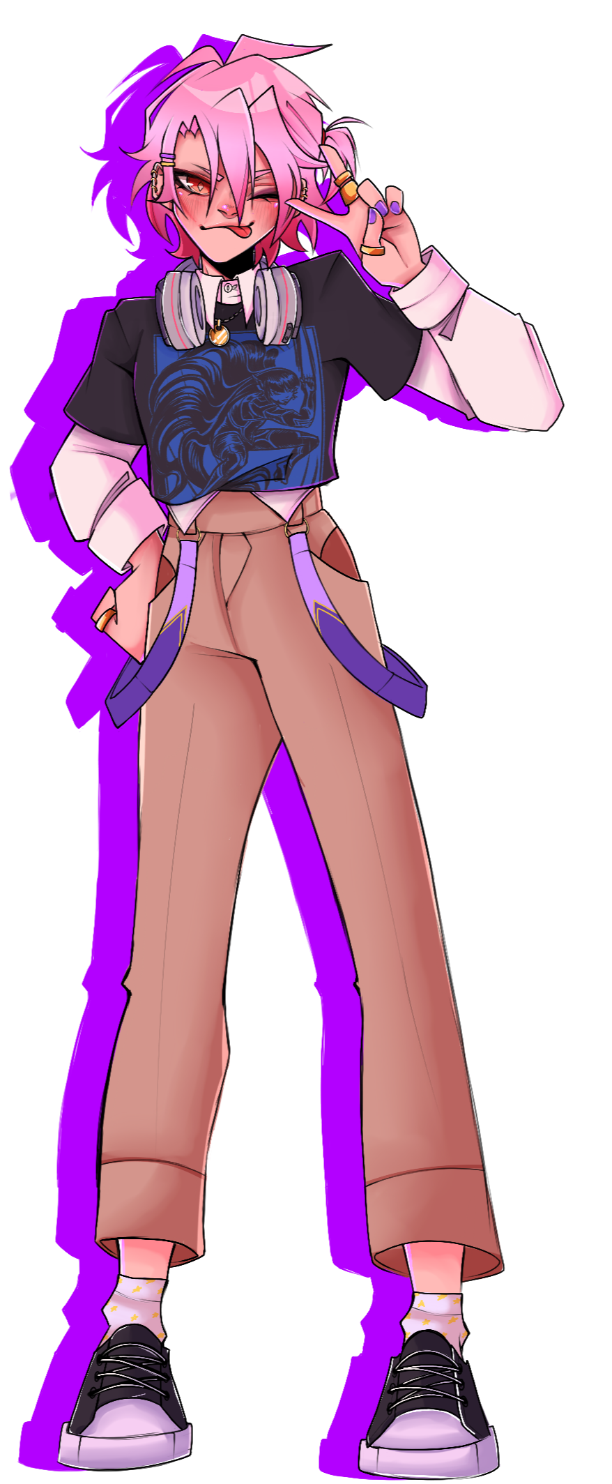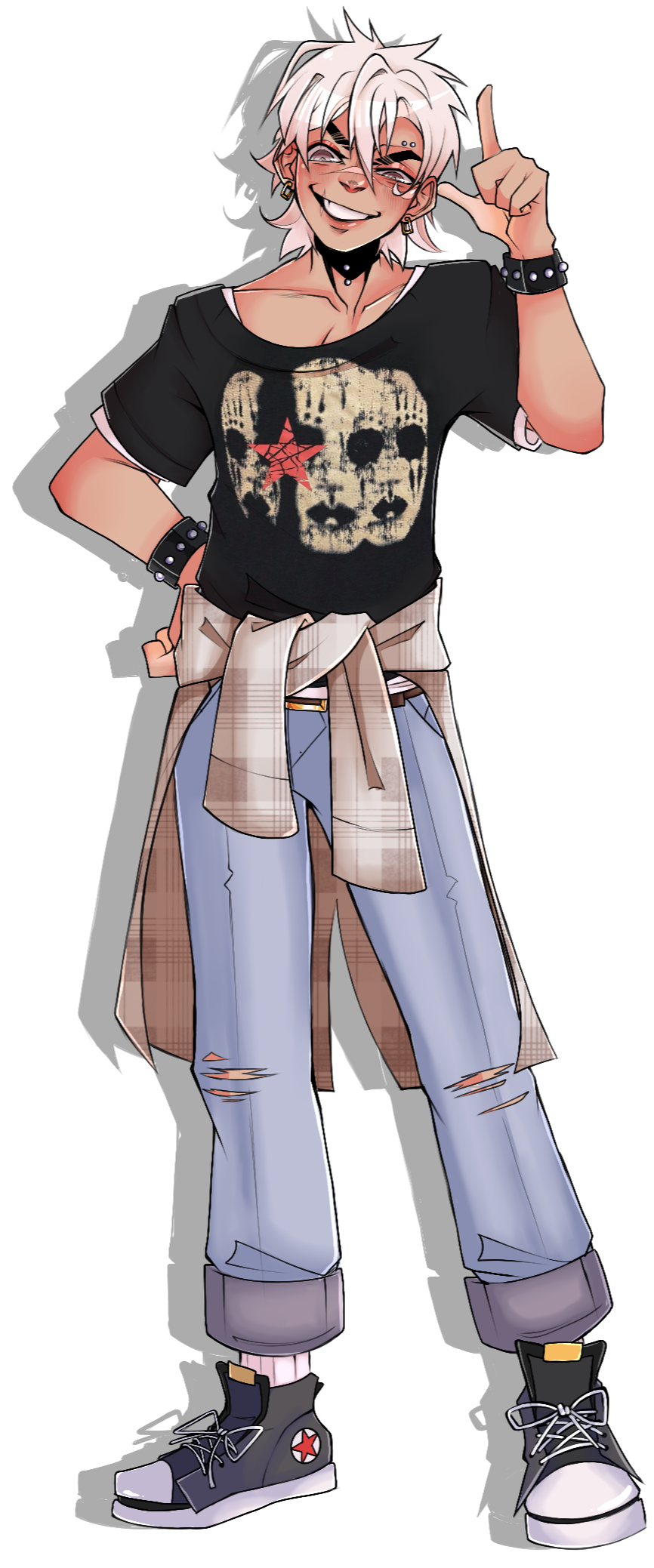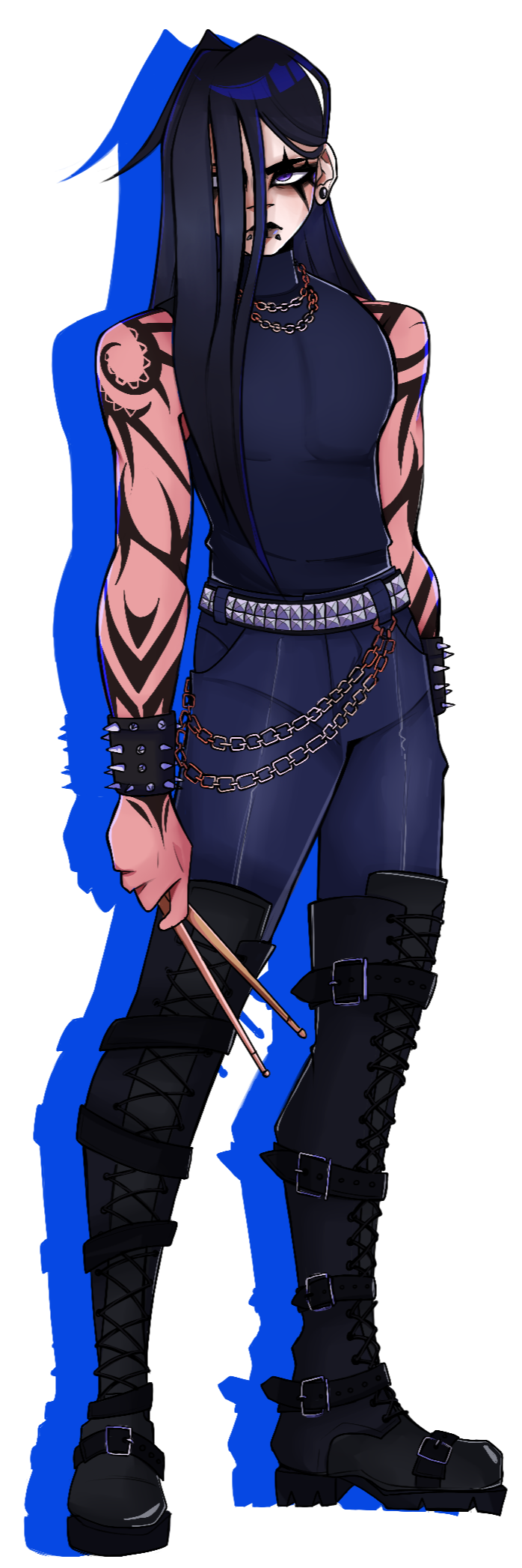 The drummer for the band 'The Eternals' and tank of their Persona team. Contrary to most, he experienced a natural Ego Death in the real world, causing him to awaken to his persona without ever having to step into headspace first.Partially mute and brooding, nothing gets him to emote. He currently lives with his sick mother as her sole caretaker, simmering with resentment towards the toxic workforce. Seeing death as a mercy, ironically he might be the most merciful of The ETERNALS... and the most loyal to Kuroshi. He believes without question that enacting karmic retribution against humanity is the only way to get them to listen and change--and if the world ends because of their actions, then that is what is meant to happen.He utilizes a drum hammer in battle and specializes in physical and shockwave skills.