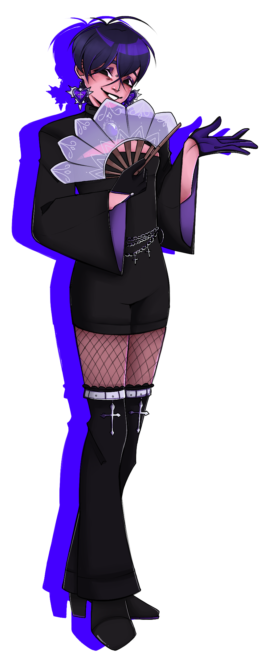 The famous rock musician “Blood Moon” and leader of the Persona team (and rock band), The Eternals. While his fame started in Okinawa, he is quickly spreading his influence all throughout Japan.Beneath that aloof hot boy persona, he is a bringer of karma following the word of an unknown figure to see to it that his dream comes true. He is fueled by nothing but revenge, hatred and an extremely personal grudge. Kuroshi's goal may seem surface level now, but as time passes his judgement will seep further than simply punishing a few bad apples. He sets his sights on the team when they start to get in his way.He specializes in Curse skills and utilizes an electric guitar in battle.